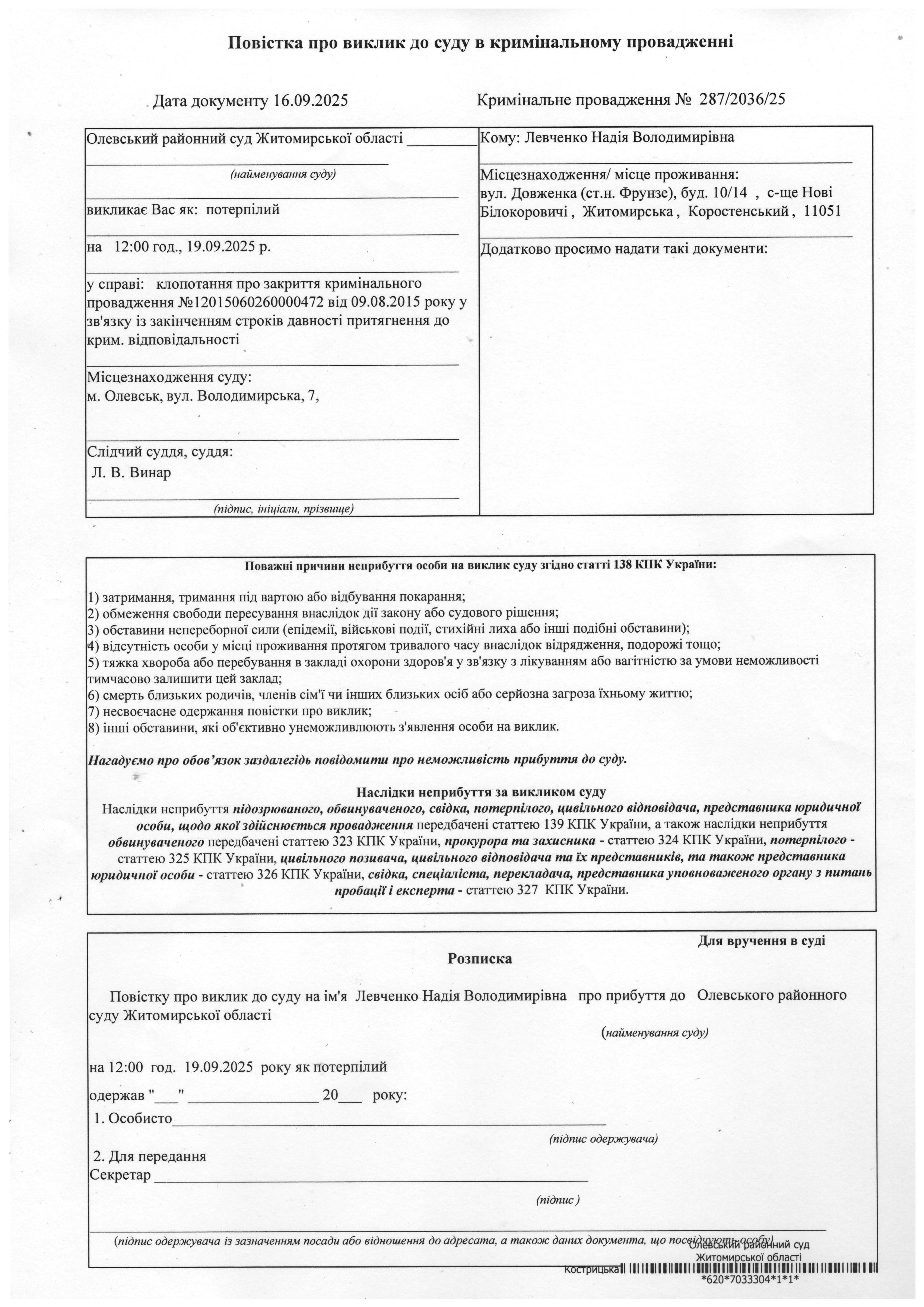 Олевський районний суд Житомирської області викликає Левченко Надія Володимирівна у справі № 287/2036/25