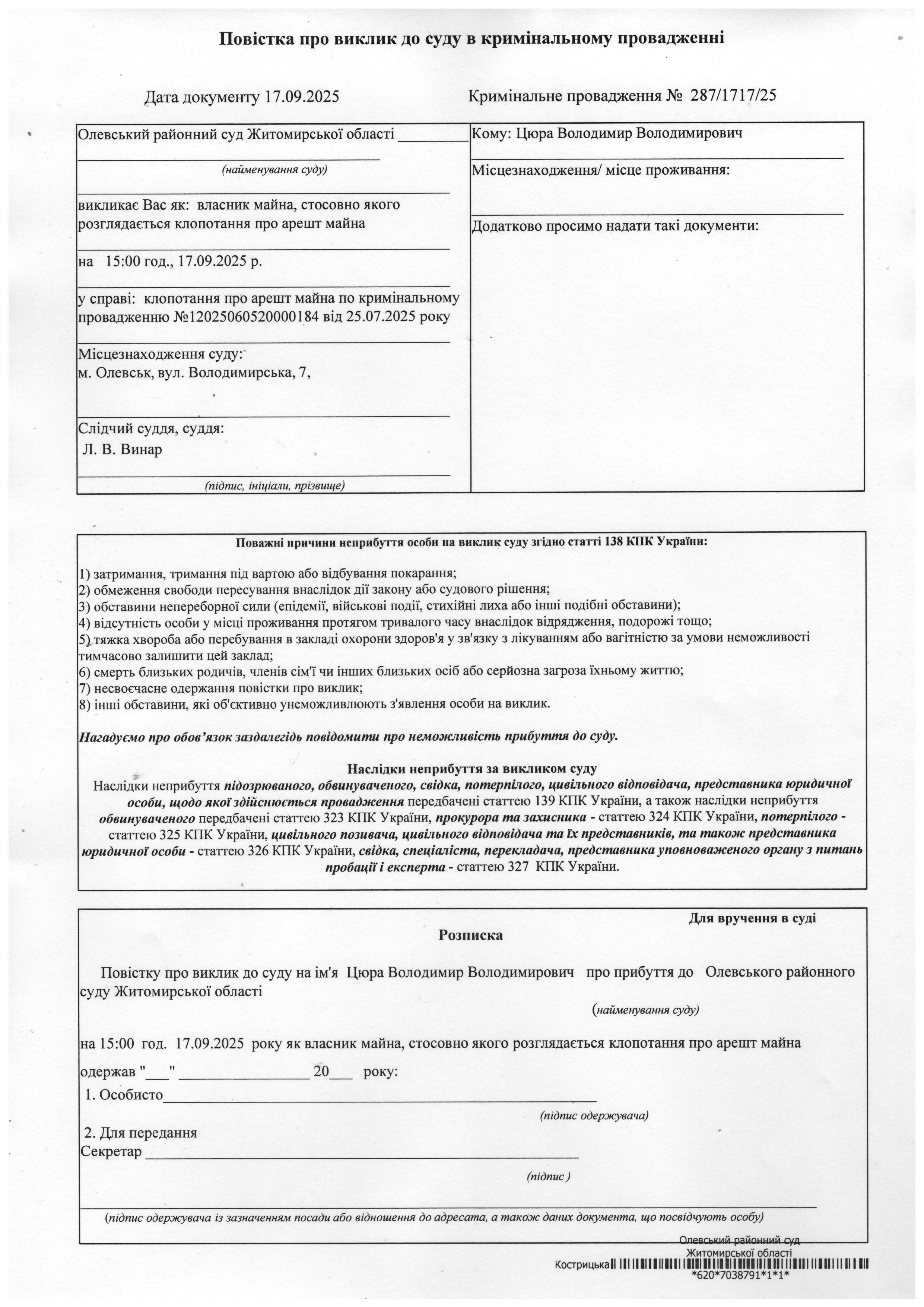 Олевський районний суд Житомирської області викликає Цюра Володимир Володимирович у справі № 287/1717/25