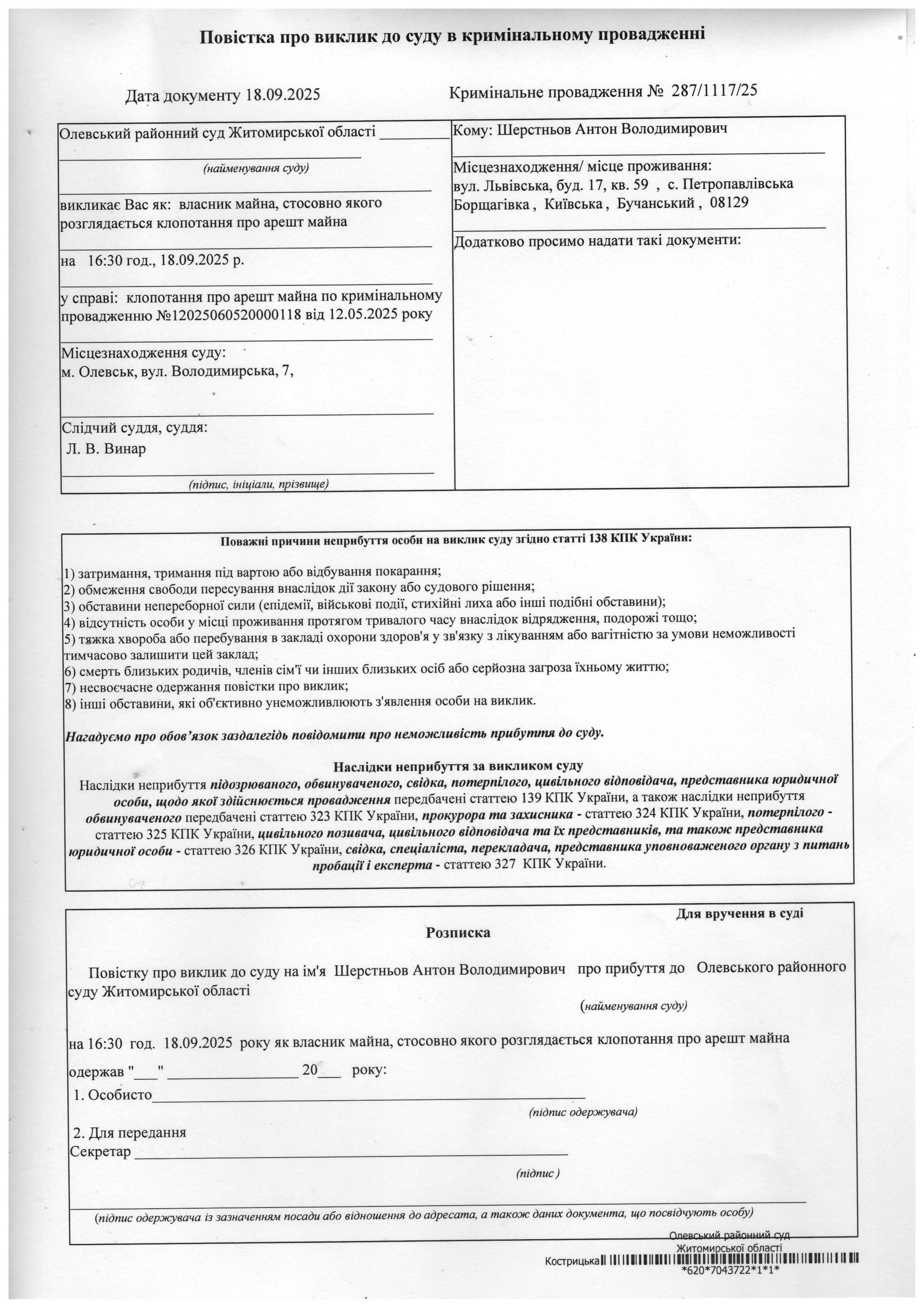 Олевський районний суд Житомирської області викликає Шерстньов Антон Володимирович у справі № 287/1117/25