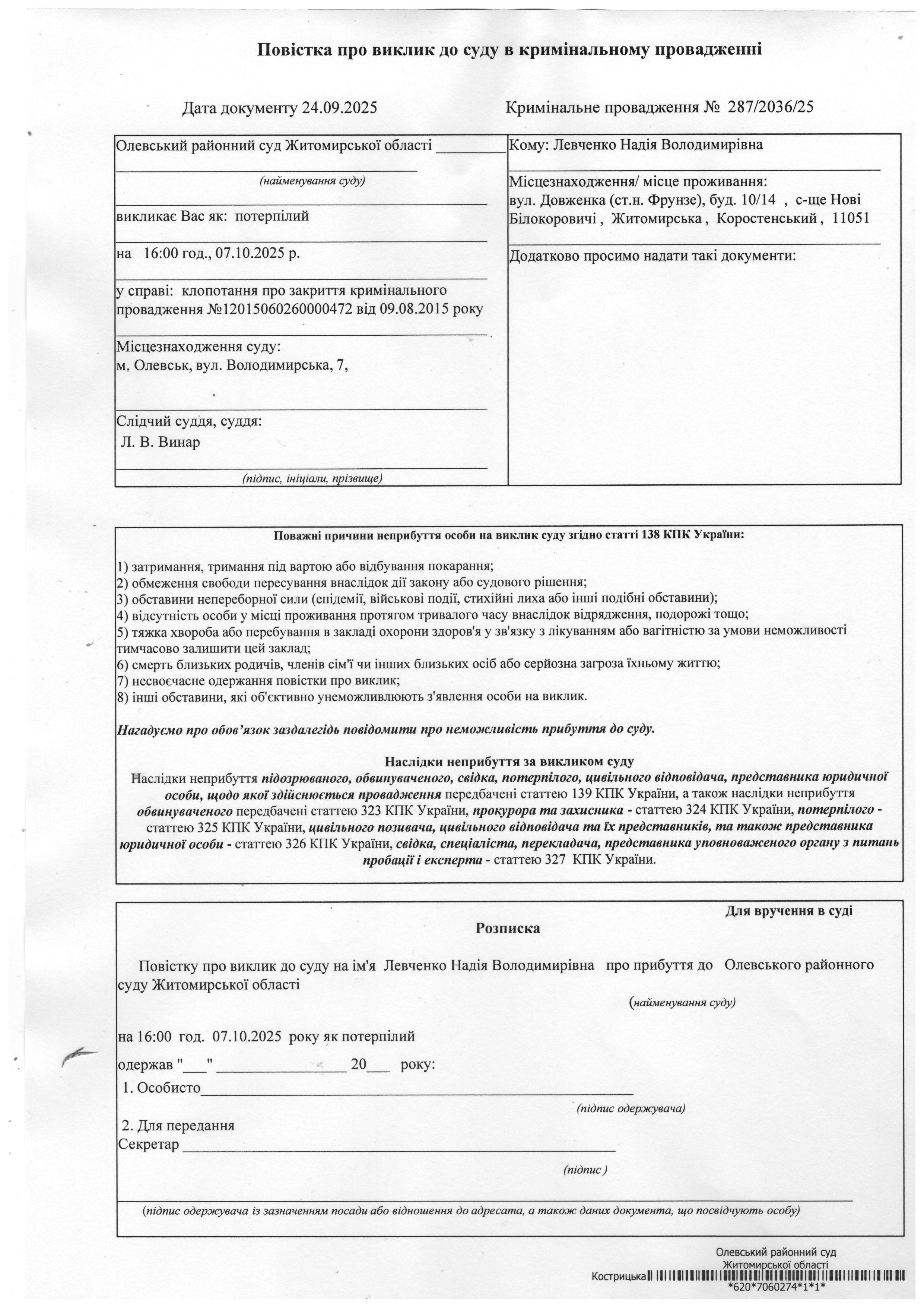 Олевський районний суд Житомирської області викликає Левченко Надія Володимирівна у справі № 287/2036/25
