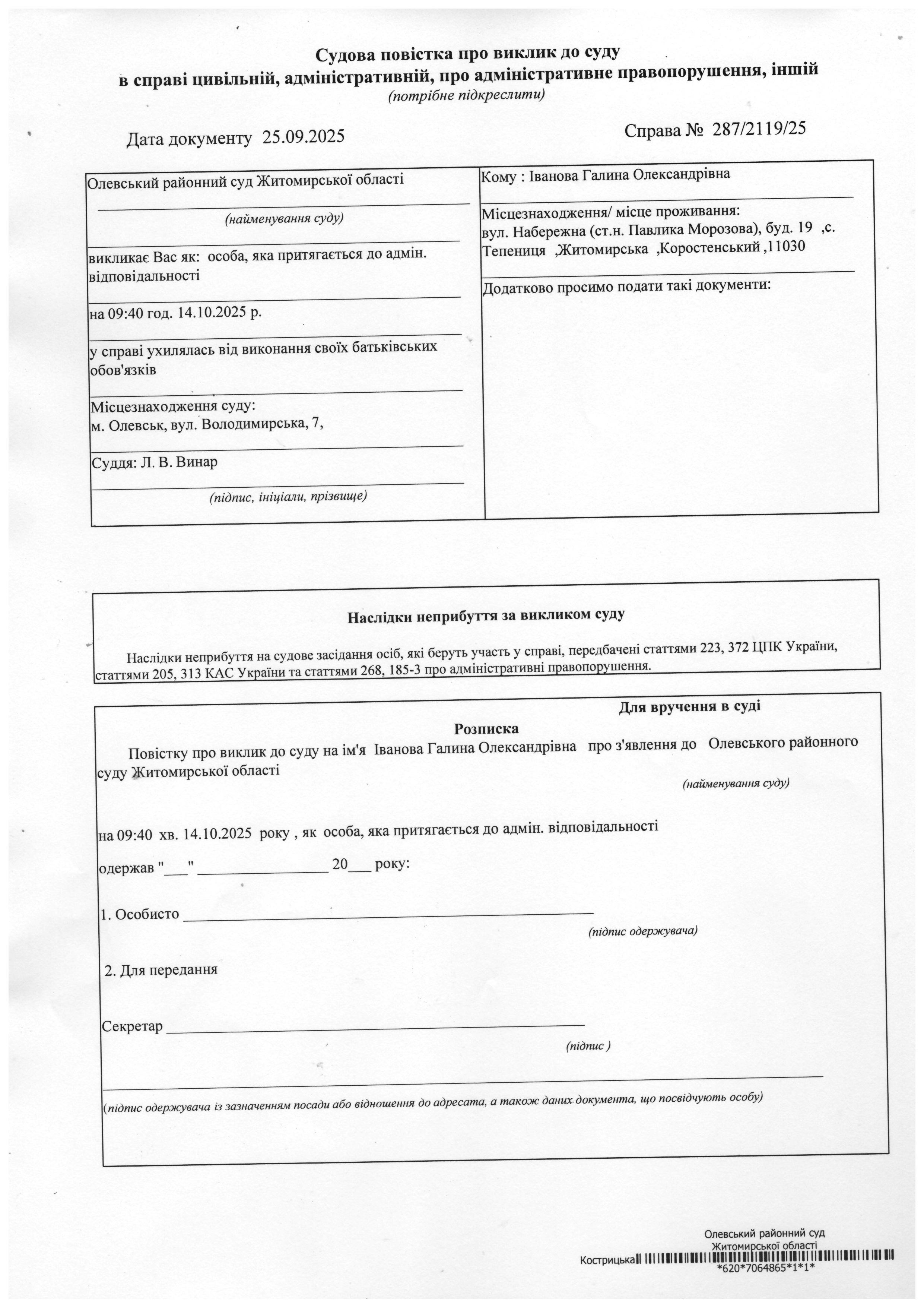 Олевський районний суд Житомирської області викликає Іванова Галина Олександрівна у справі № 287/2119/25