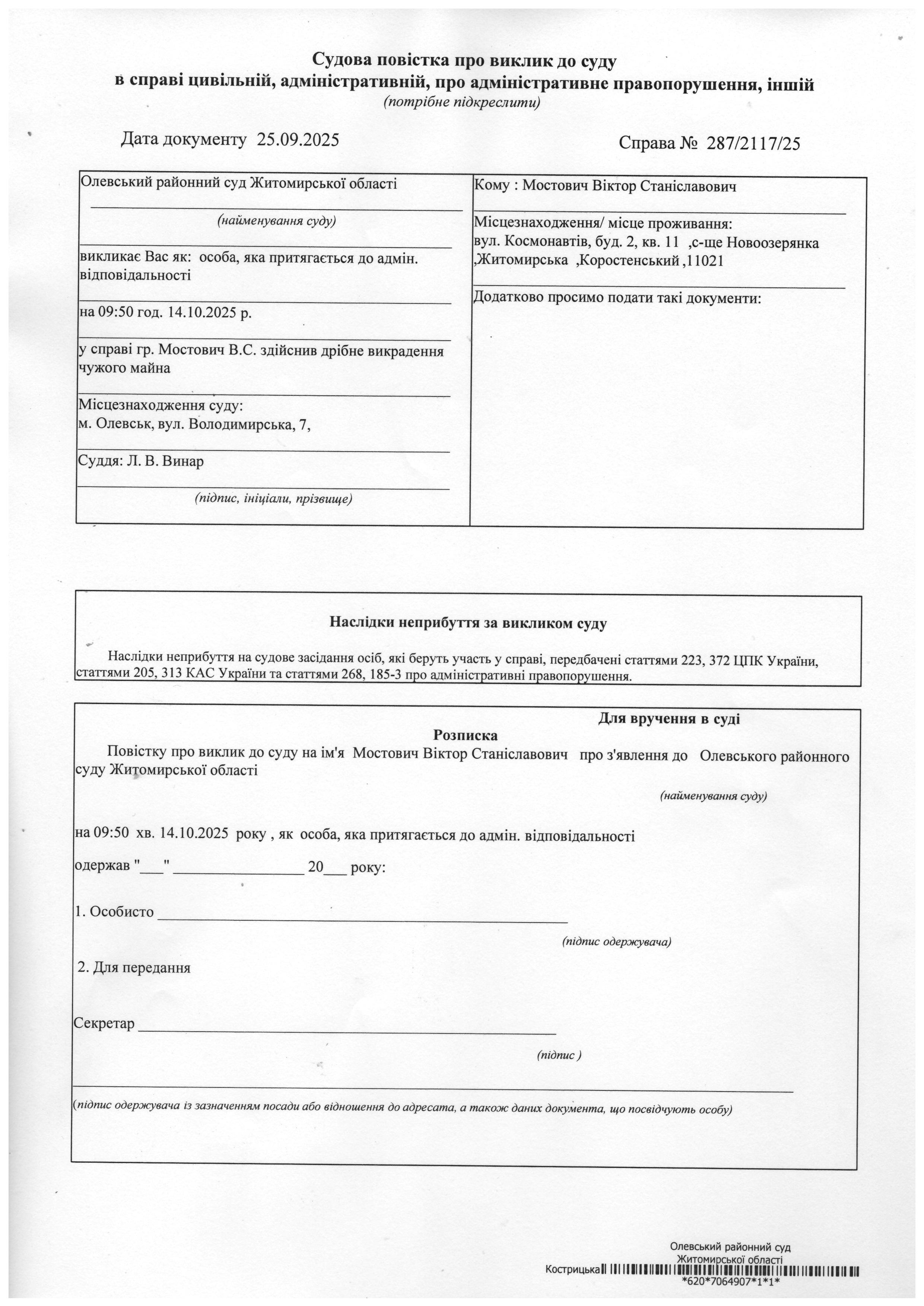 Олевський районний суд Житомирської області викликає Мостович Віктор Станіславович у справі № 287/2117/25