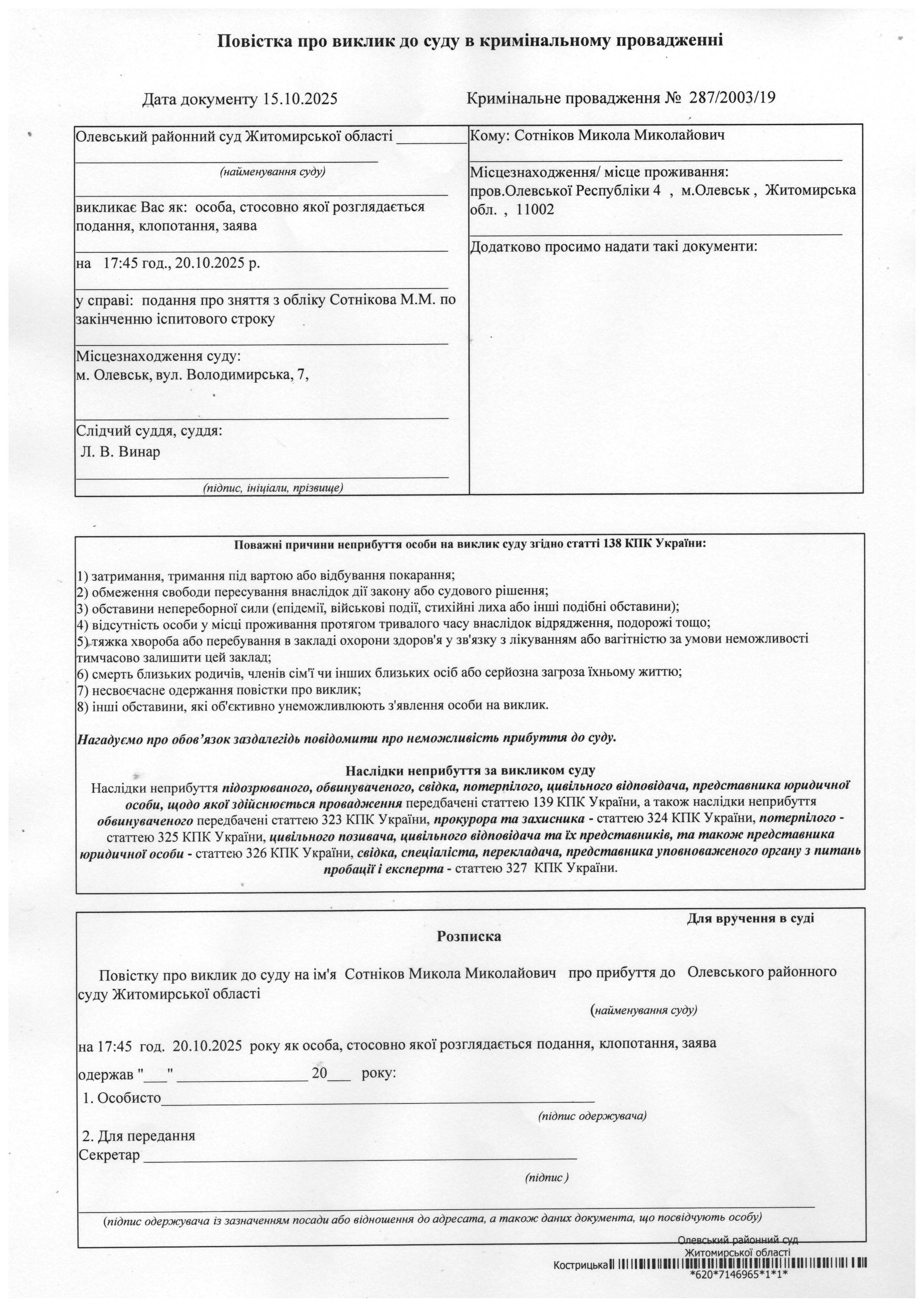 Олевський районний суд Житомирської області викликає Сотніков Микола Миколайович у справі № 287/2003/19