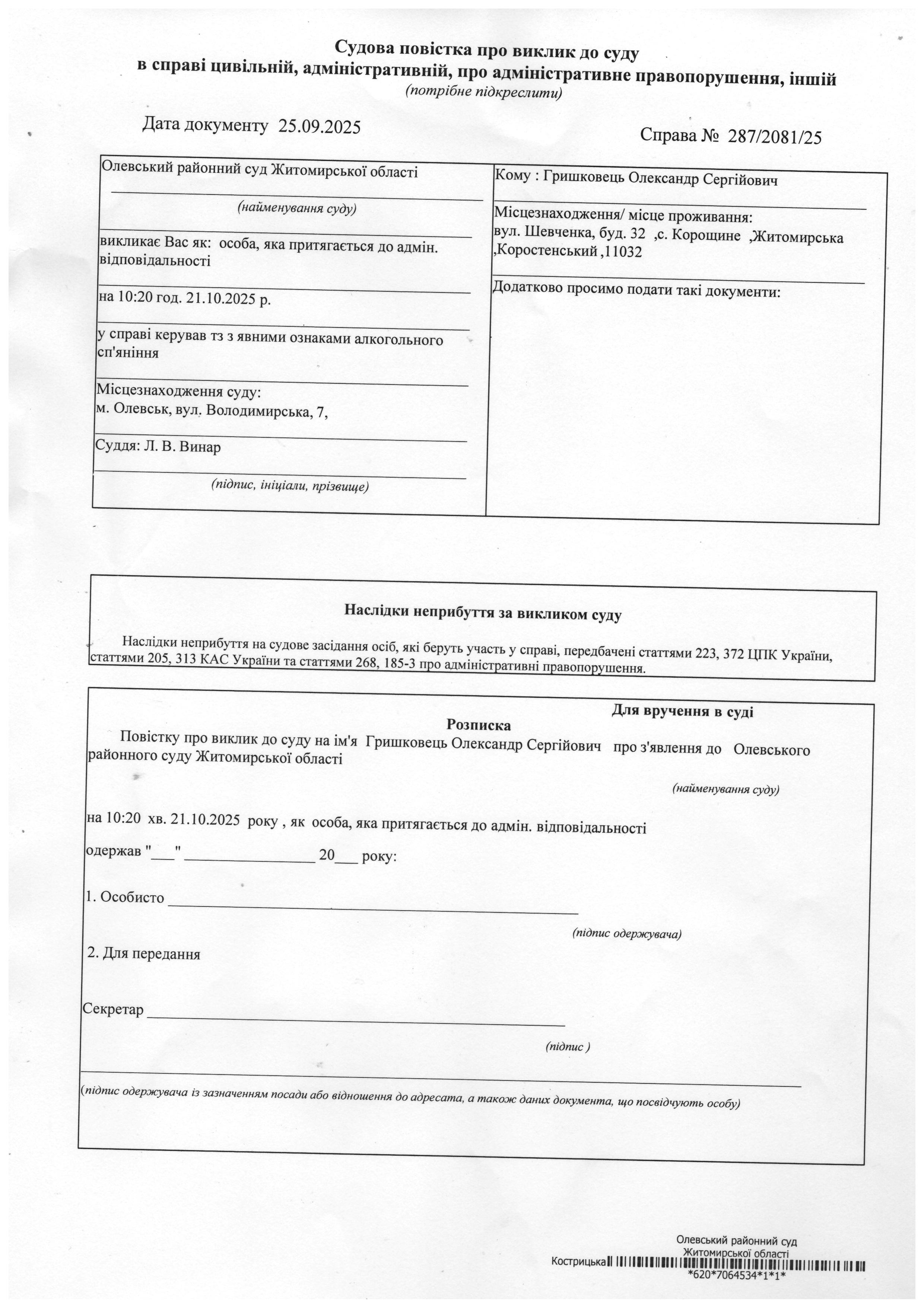 Олевський районний суд Житомирської області викликає Гришковець Олександр Сергійович у справі № 287/2081/25