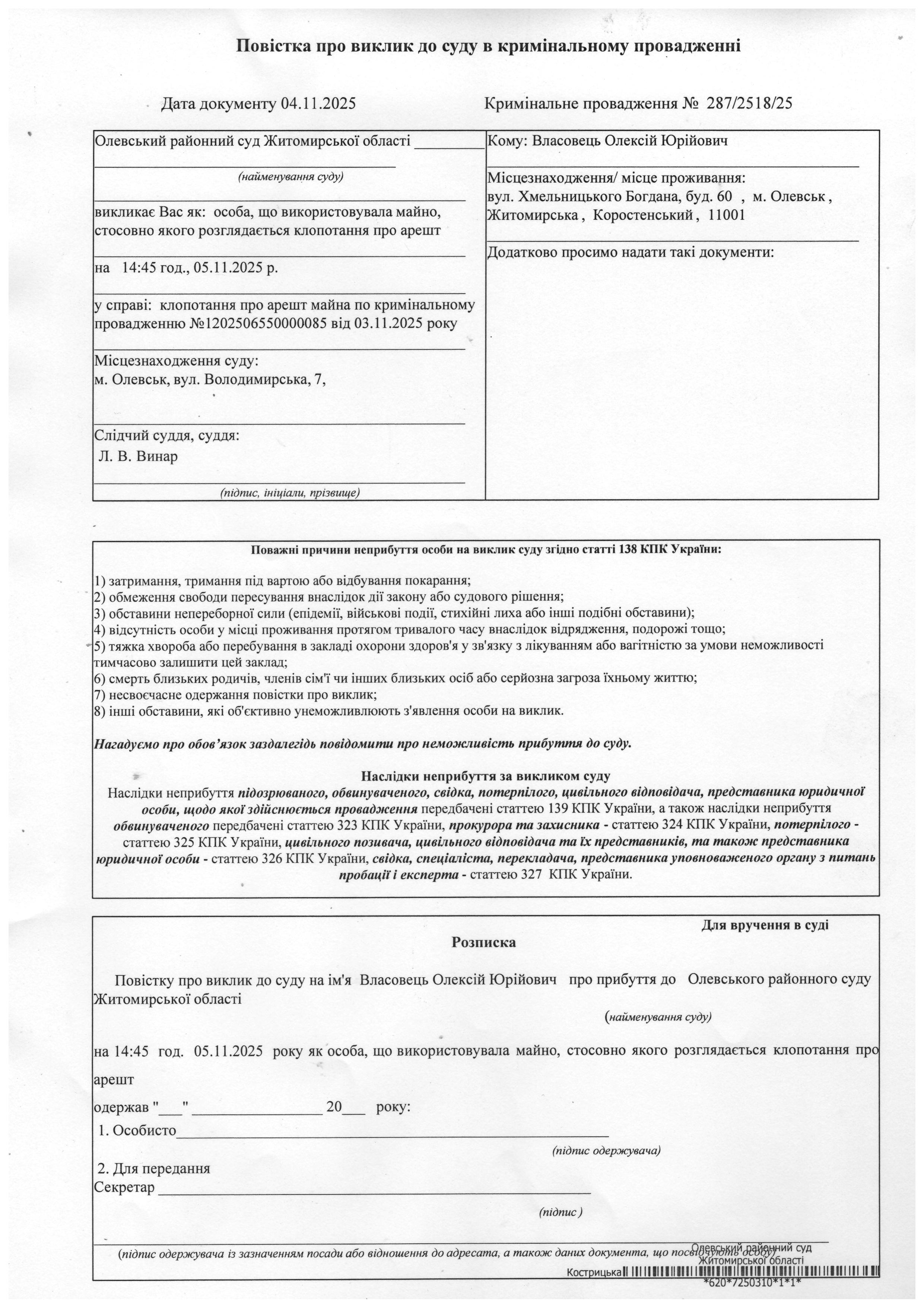 Олевський районний суд Житомирської області викликає Власовець Олексій Юрійович у справі № 287/2518/25