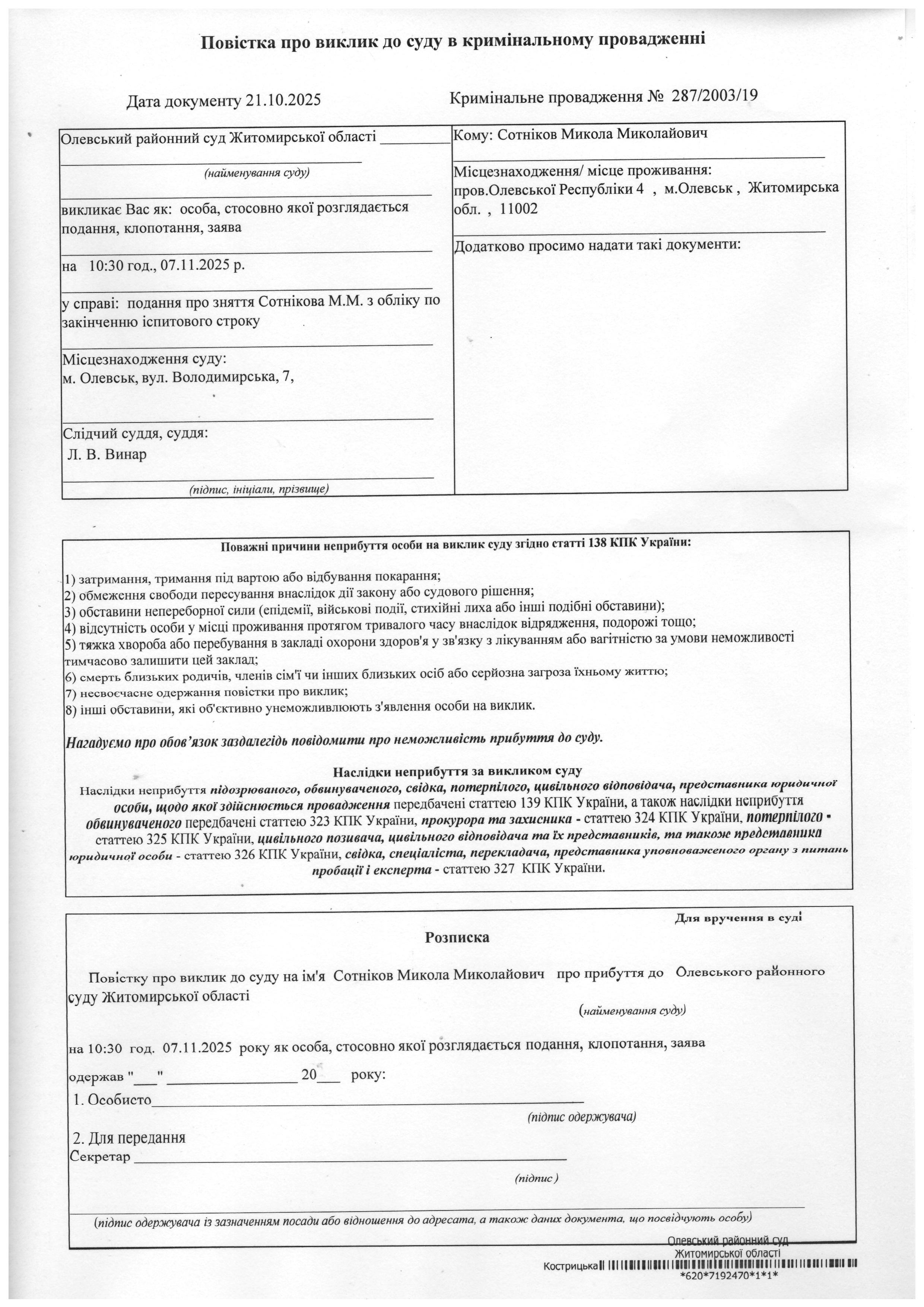 Олевський районний суд Житомирської області викликає Сотніков Микола Миколайович у справі № 287/2003/19