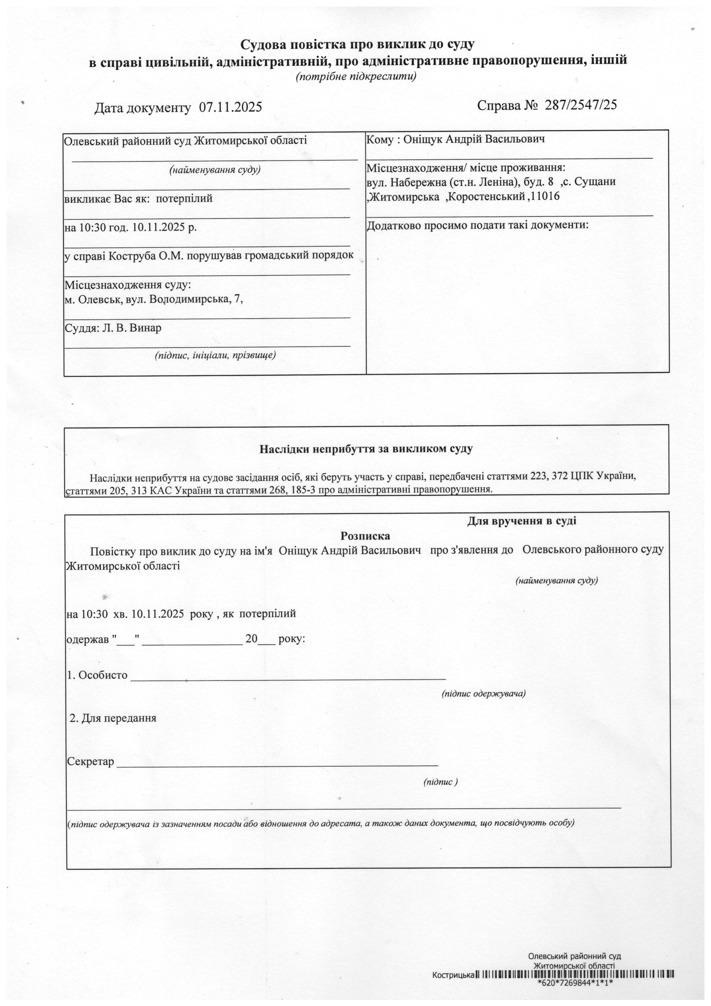 Олевський районний суд Житомирської області викликає Оніщук Андрій Васильович у справі № 287/2547/25