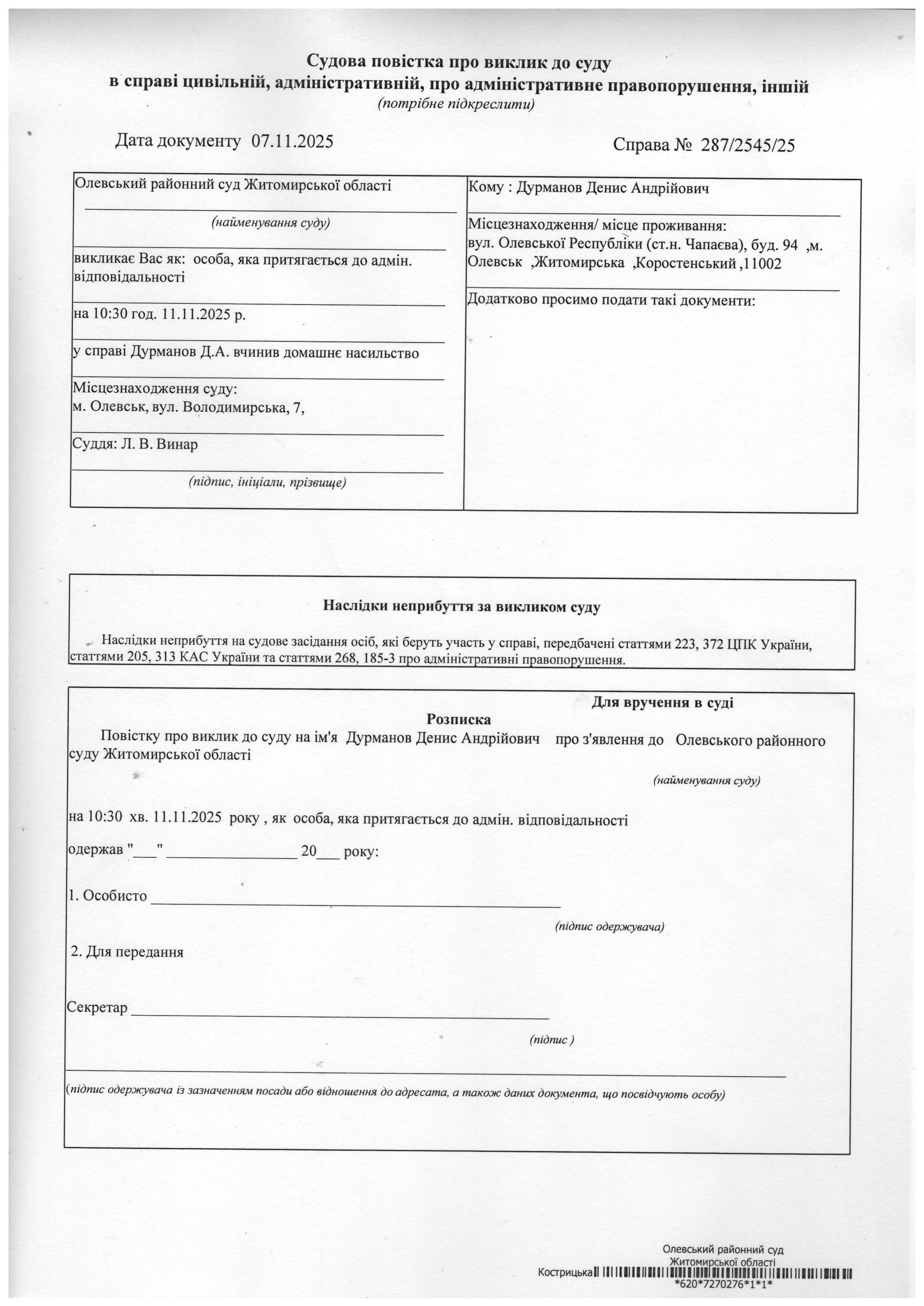 Олевський районний суд Житомирської області викликає Дурманов Денис Андрійович у справі № 287/2545/25