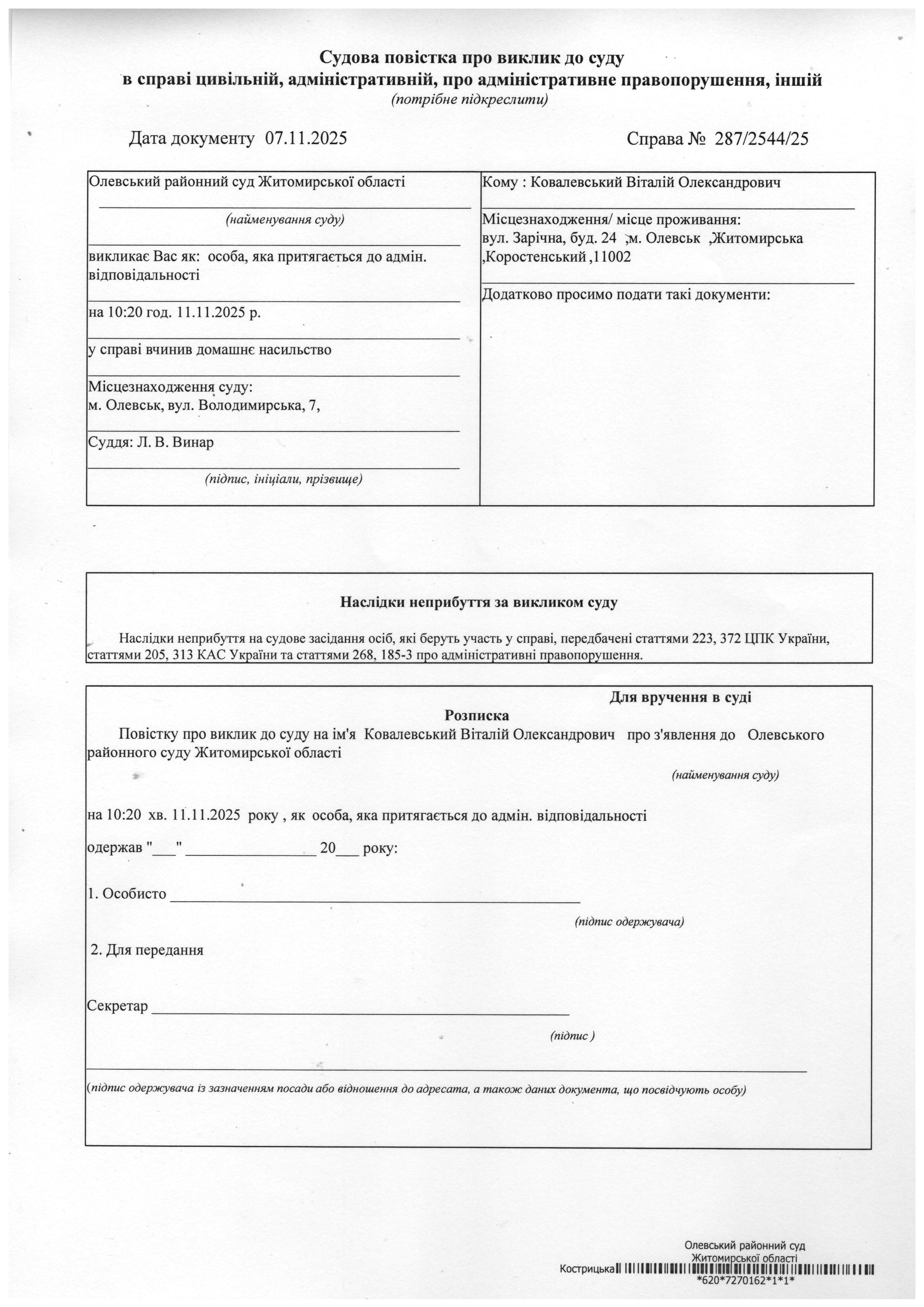 Олевський районний суд Житомирської області викликає Ковалевський Віталій Олександрович у справі № 287/2544/25