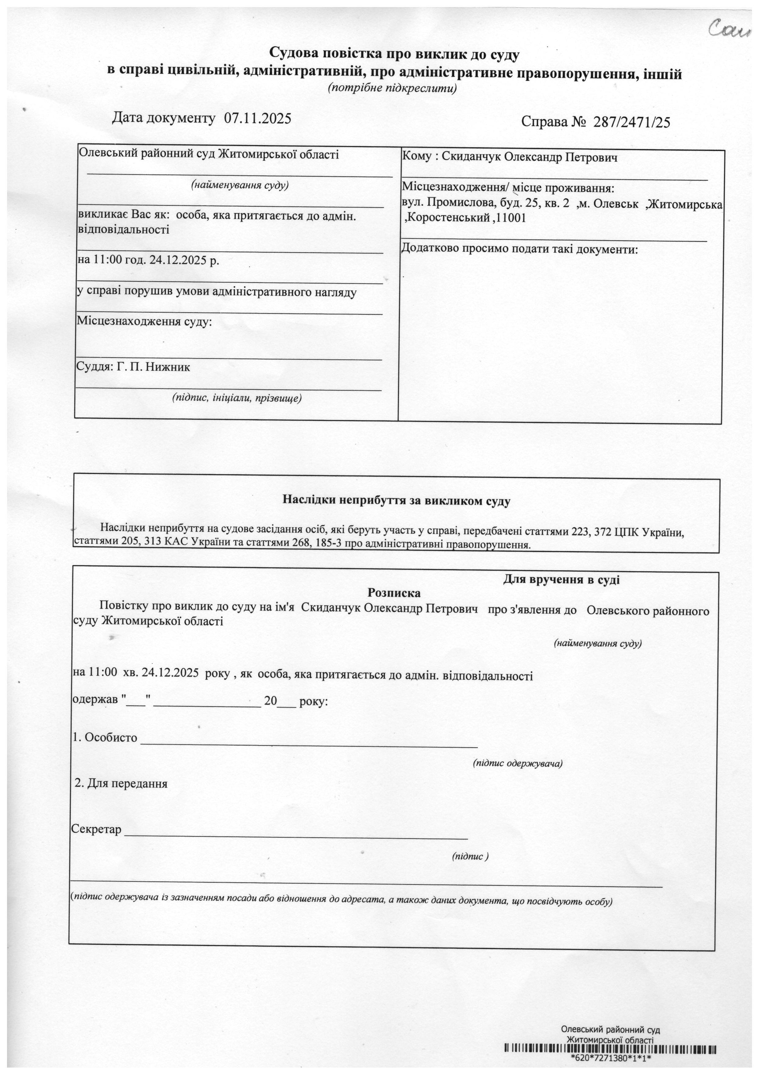 Олевський районний суд Житомирської області викликає Скиданчук Олександр Петрович у справі № 287/2471/25