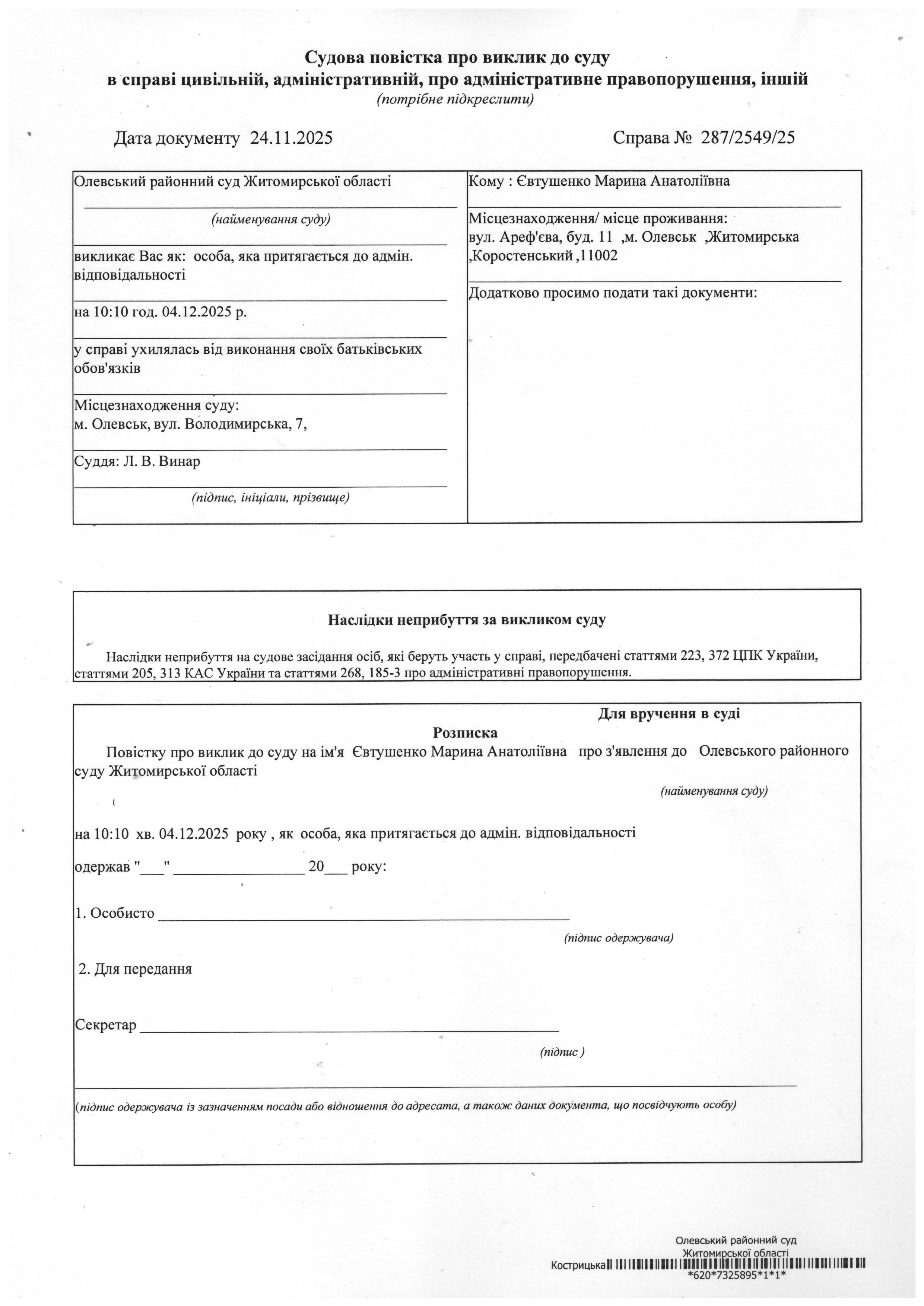 Олевський районний суд Житомирської області викликає Євтушенко Марина Анатоліївна у справі № 287/2549/25