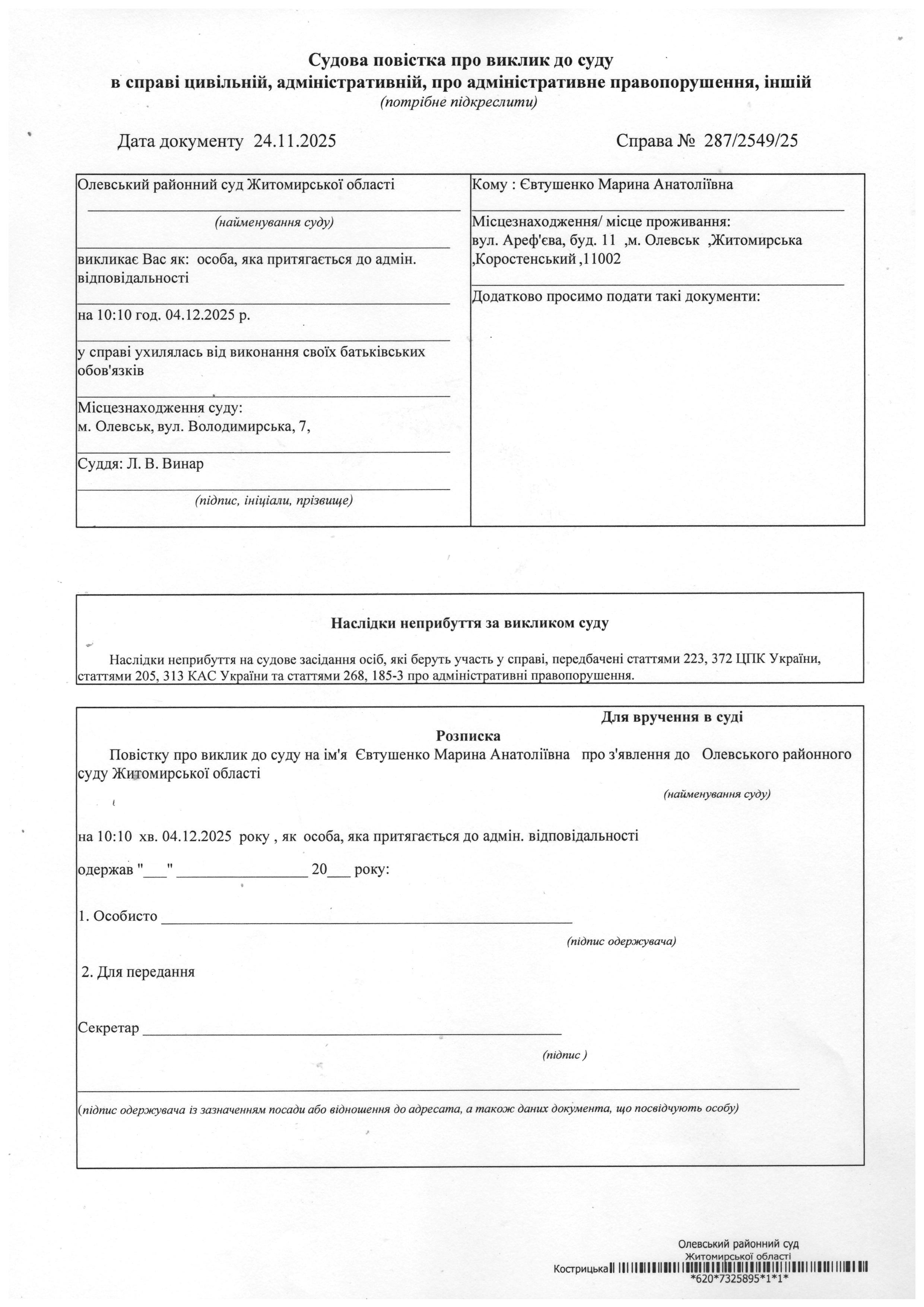 Олевський районний суд Житомирської області викликає Євтушенко Марина Анатоліївна у справі № 287/2549/25