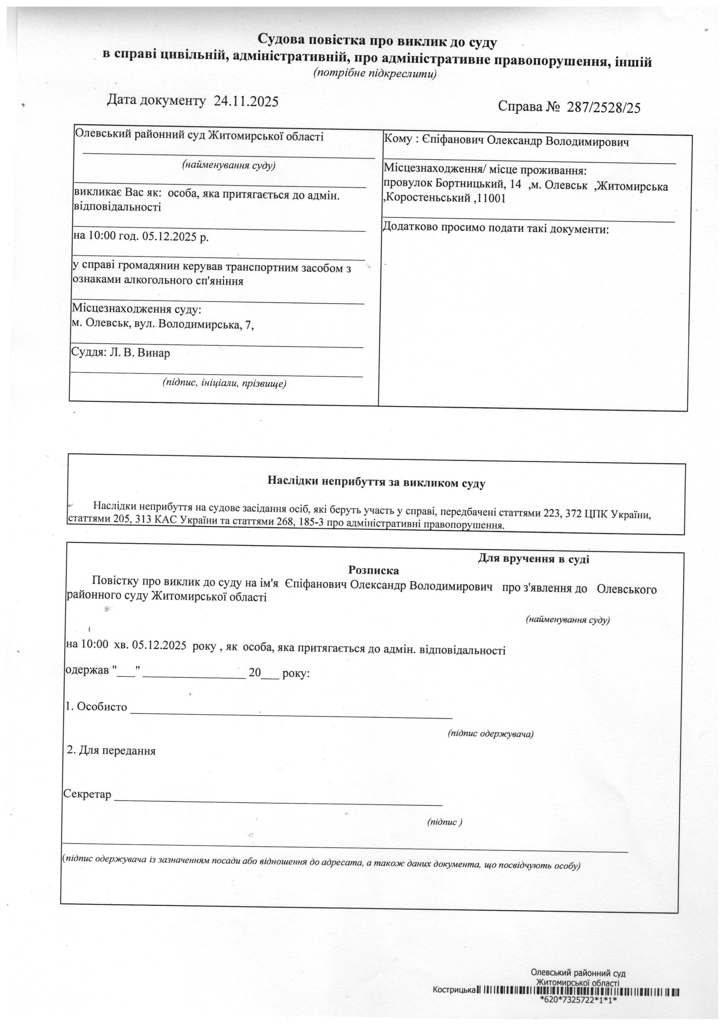 Олевський районний суд Житомирської області викликає Єпіфанович Олександр Володимирович у справі № 287/2528/25