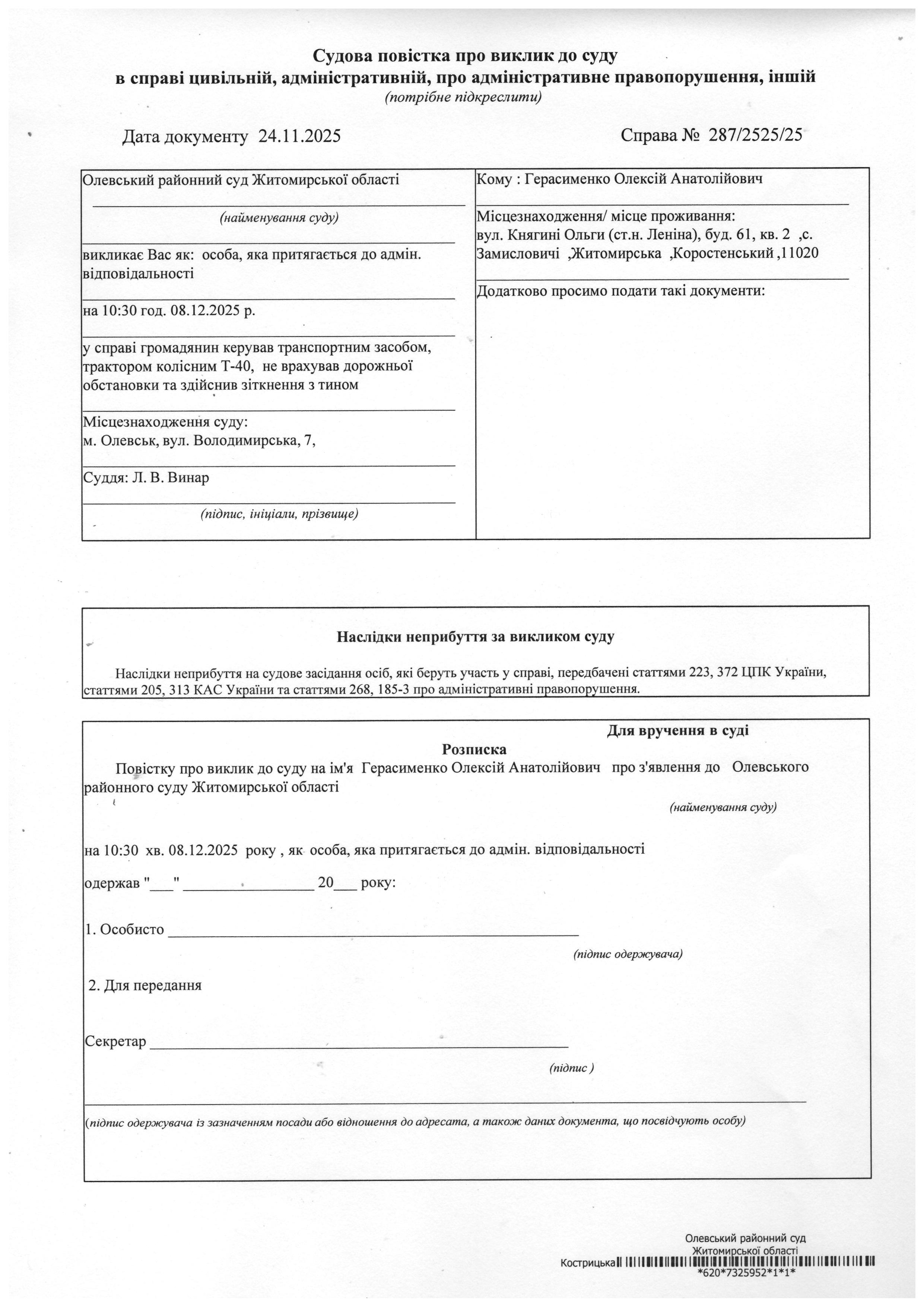 Олевський районний суд Житомирської області викликає Герасименко Олексій Анатолійович у справі № 287/2525/25