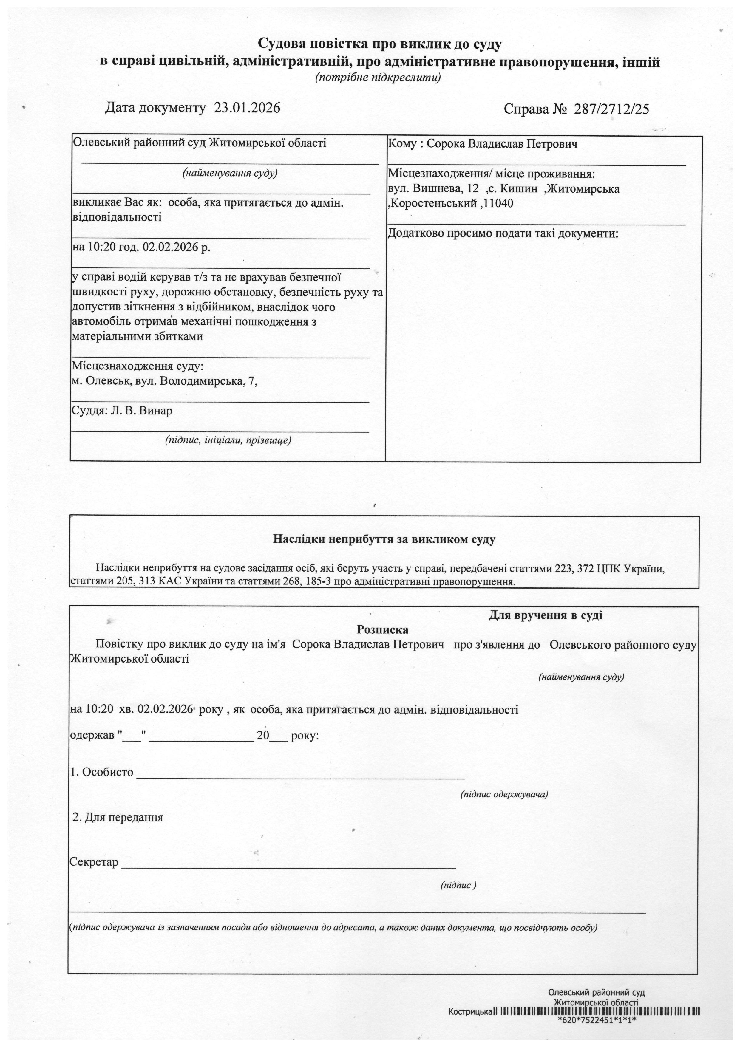 Олевський районний суд Житомирської області викликає Сорока Владислав Петрович у справі № 287/2712/25