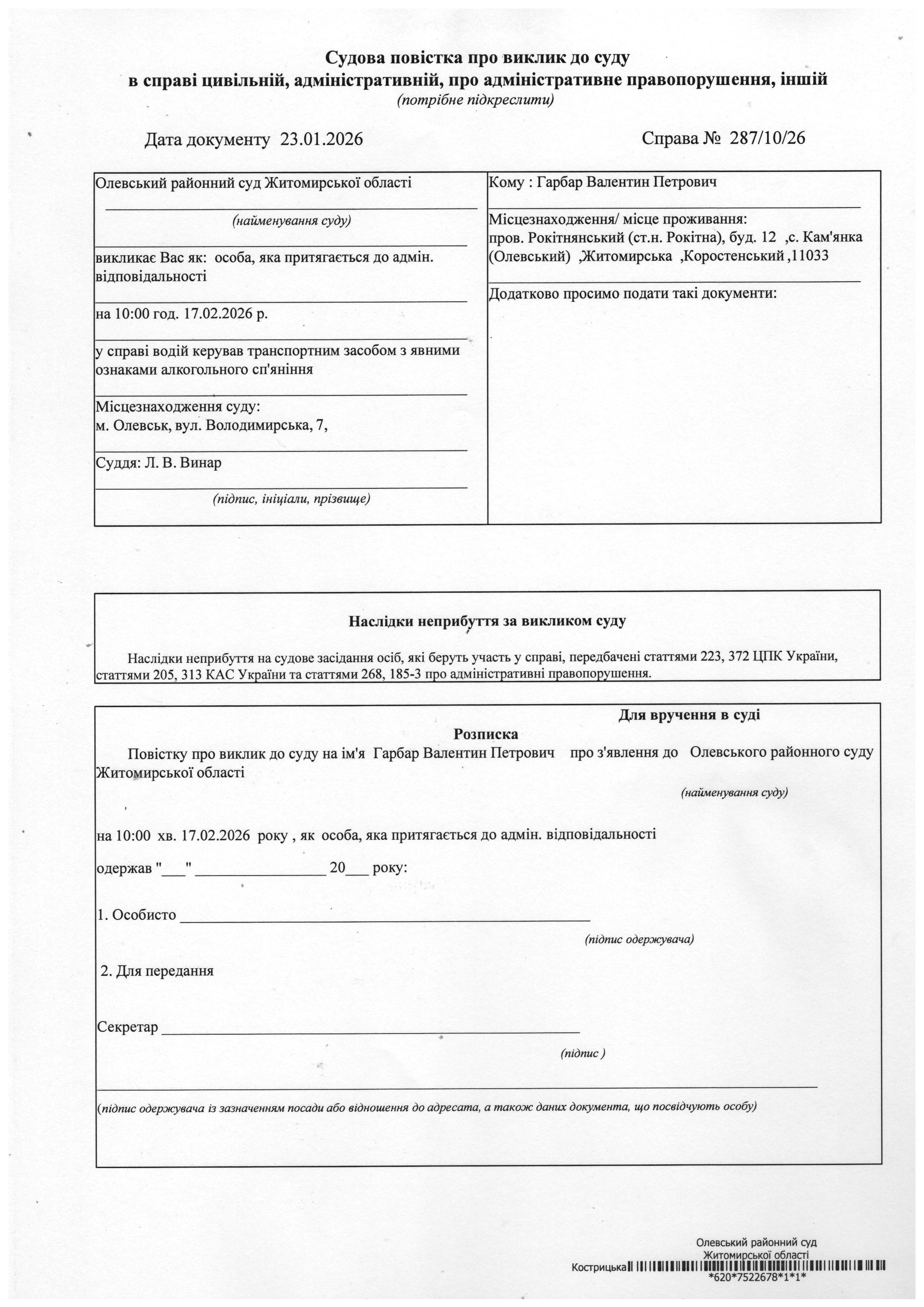 Олевський районний суд Житомирської області викликає Гарбар Валентин Петрович у справі № 287/10/26
