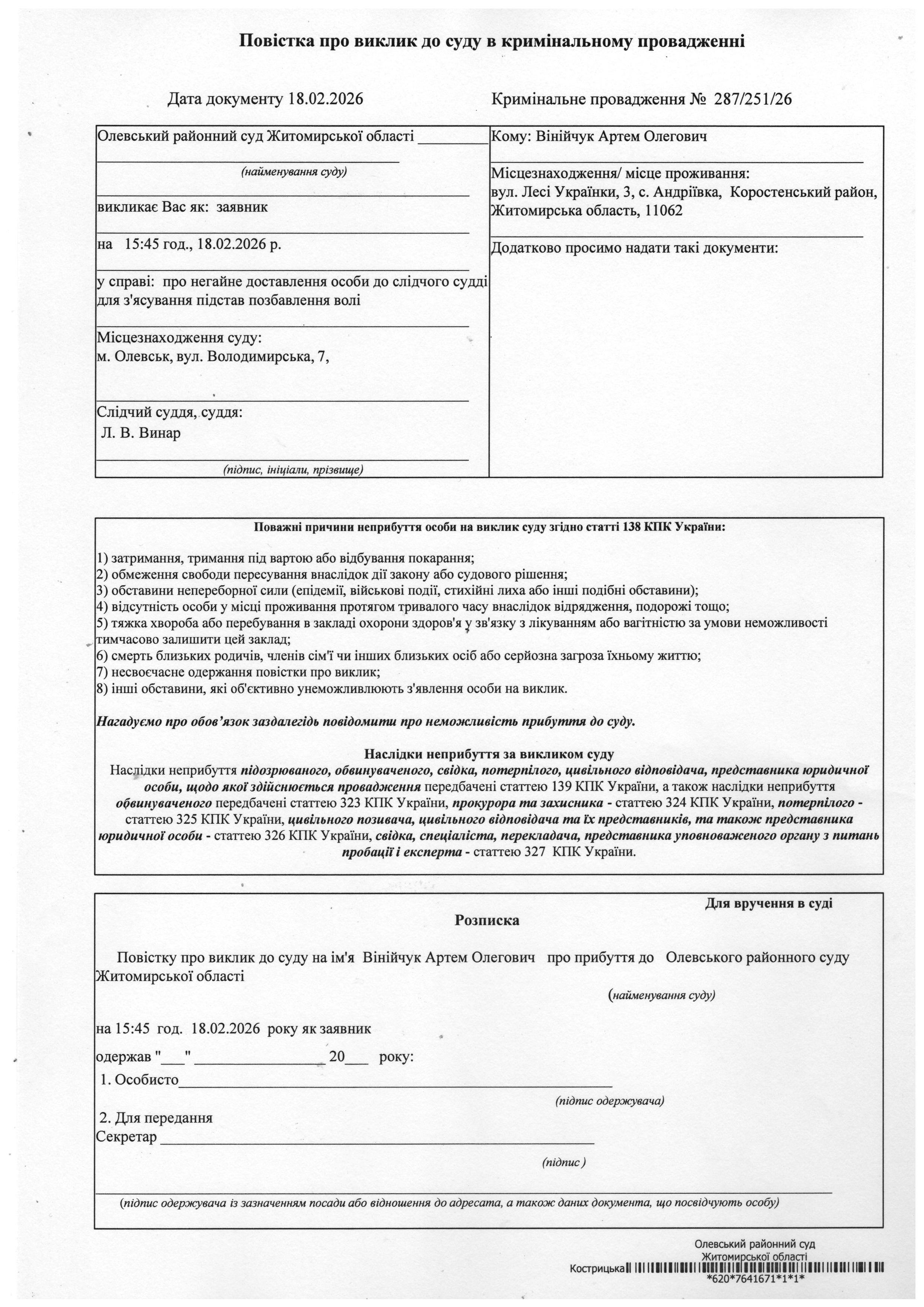Олевський районний суд Житомирської області викликає Вінійчук Артем Олегович у справі № 287/251/26