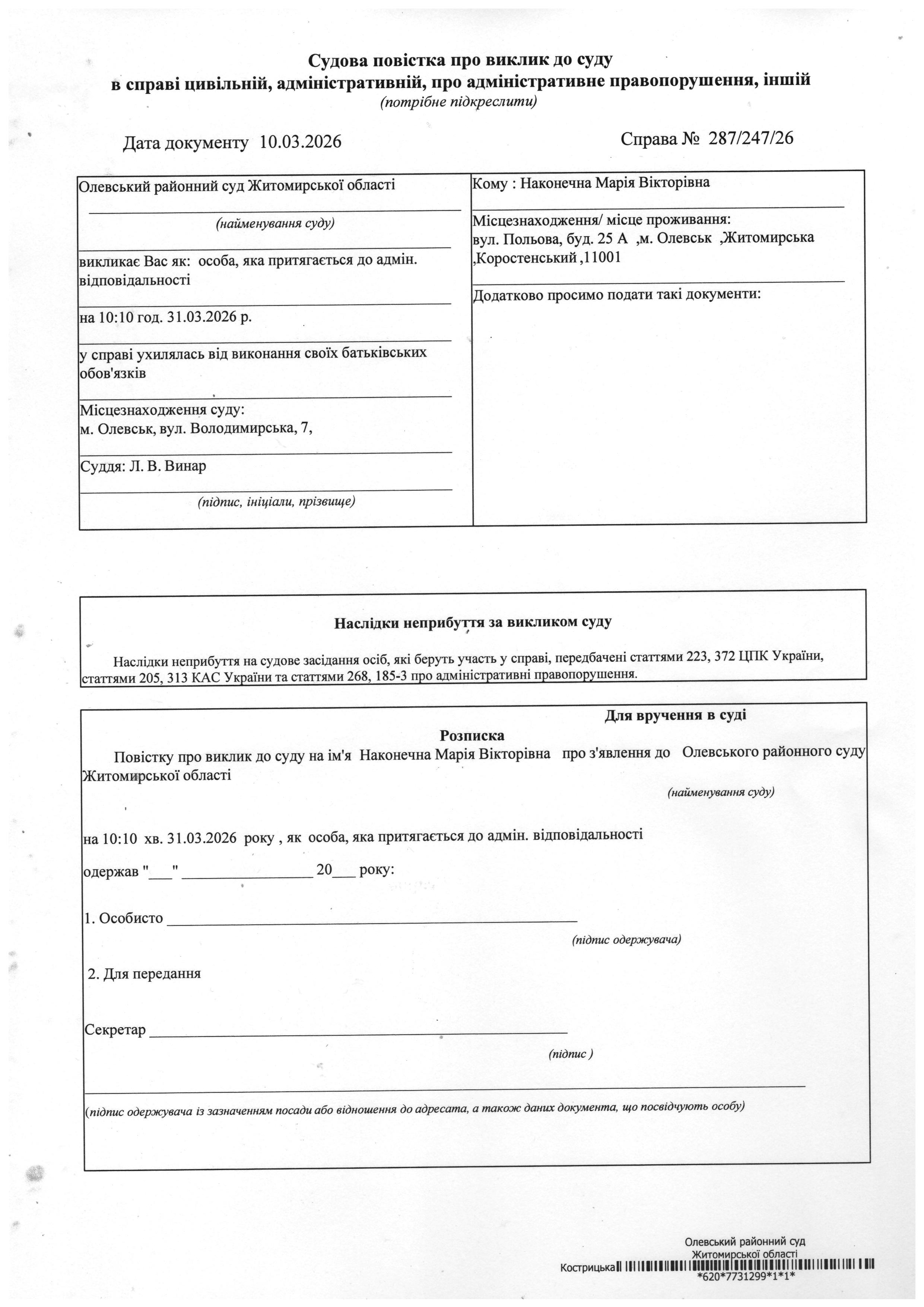 Олевський районний суд Житомирської області викликає Наконечна Марія Вікторівна у справі № 287/247/26